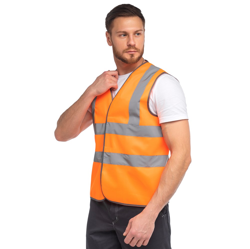 Жилет сигнальный изготовлен в соответствии с ГОСТ. Изделие выполнено из трикотажного полотна (100% ПЭ, плотностью120 гр./м², ВО отделкой). Для безопасной работы сотрудника в местах с плохим освещением на сигнальном жилете предусмотрено 4 светоотражающих полосы 50 мм. Объем регулируется по ширине на 4 см, за счет удлинённой ответной части липучки.
