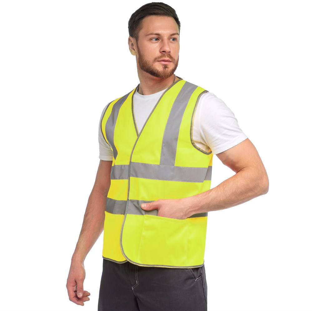 Жилет сигнальный изготовлен в соответствии с ГОСТ. Изделие выполнено из трикотажного полотна (100% ПЭ, плотностью120 гр./м², ВО отделкой). Для безопасной работы сотрудника в местах с плохим освещением на сигнальном жилете предусмотрено 4 светоотражающих полосы 50 мм. Жилет с накладными карманами, окантовочной тесьмой по пройме и периметру. Объем регулируется по ширине на 4 см, за счет удлинённой ответной части липучки.