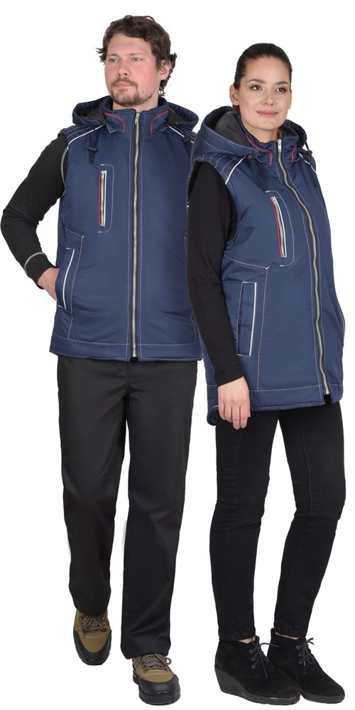 Жилет, с утеплённой подкладкой, однотонный с отделочными строчками и отделочным кантом контрастного цвета. Жилет с воротником стойка, с застёжкой на молнию, с внутренним ветрозащитным клапаном, со съёмным капюшоном, который пристёгивается к воротнику на молнию. Спинка жилета, удлинённая с фигурной линией низа. Жилет с одним нагрудным карманом с молнией и двумя нижними боковыми карманами. Внутренний воротник из флиса. Объём капюшона по лицевому вырезу регулируется шнуром с фиксаторами. Подкладка с утеплителем, с внутренним карманом с молнией. В жилете предусмотрен световозвращающий кант, что обеспечивает видимость при любом освещении.