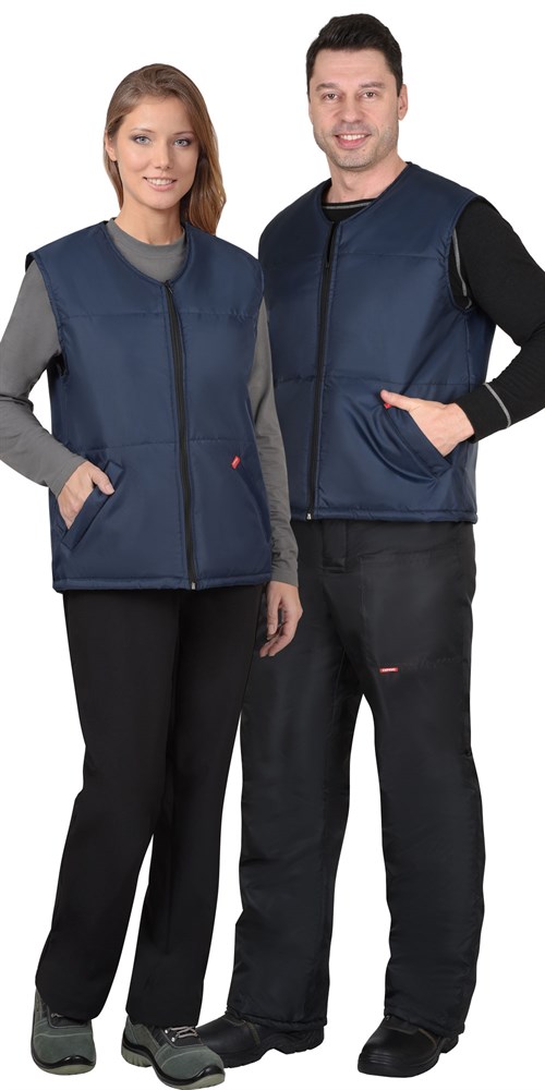 Жилет с горизонтальными строчками стежки полочек и спинки. V-образным вырезом горловины, с центральной застежкой-молнией, наклонными боковыми прорезными карманами с "листочкой".