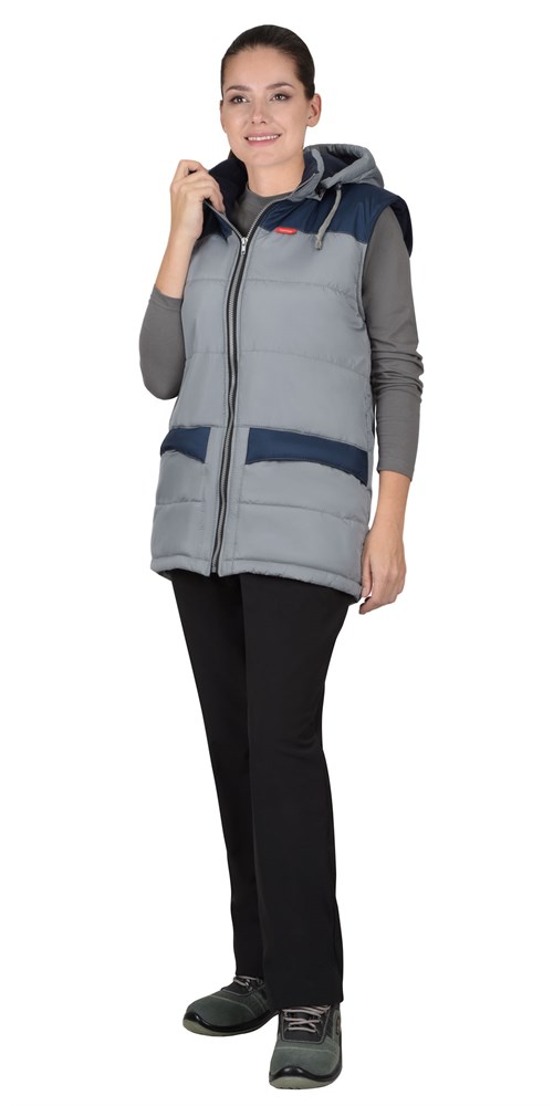 Жилет двухцветный, утеплённый, стёганый, прямого силуэта, удлинённый, с застёжкой на молнию, с воротником стойка, со съёмным капюшоном, с карманами с клапанами, с внутренним карманом на молнии. Внутренний воротник из «флиса» для комфорта в области прилегания к шее. Спинка удлинённая относительно полочек с фигурной линией низа. Подкладка жилета и капюшона из флиса. Капюшон пристёгивается к жилету при помощи молнии, объём капюшона по лицевому вырезу регулируется шнуром с фиксаторами.