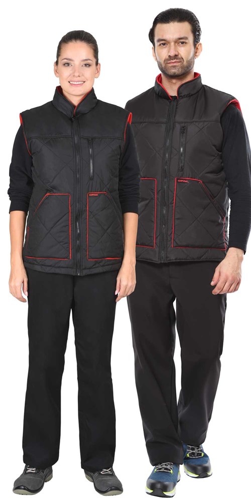 Жилет утеплённый, стёганный, прямого силуэта, на подкладке из флиса с центральной бортовой застёжкой на молнию, с воротником стойка, с нагрудным карманом с молнией и нижними фигурными утеплёнными карманами. Жилет с удлинённой спинкой. ГОСТ 25295-2003