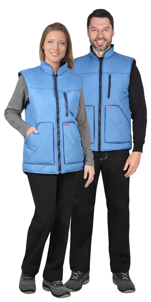 Жилет утеплённый, стёганный, прямого силуэта, на подкладке из флиса с центральной бортовой застёжкой на молнию, с воротником стойка, с нагрудным карманом с молнией и нижними фигурными утеплёнными карманами. Жилет с удлинённой спинкой. ГОСТ 25295-2003