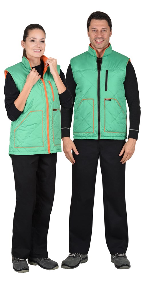 Жилет утеплённый, стёганный, прямого силуэта, на подкладке из флиса с центральной бортовой застёжкой на молнию, с воротником стойка, с нагрудным карманом с молнией и нижними фигурными утеплёнными карманами. Жилет с удлинённой спинкой. ГОСТ 25295-2003