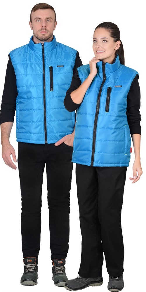 Жилет утепленный; стеганый ,прямого силуэта , с центральной застежкой на тесьму «молния» до верха; полочка с верхним карманом на молнии и двумя нижними карманами с листочкой.
