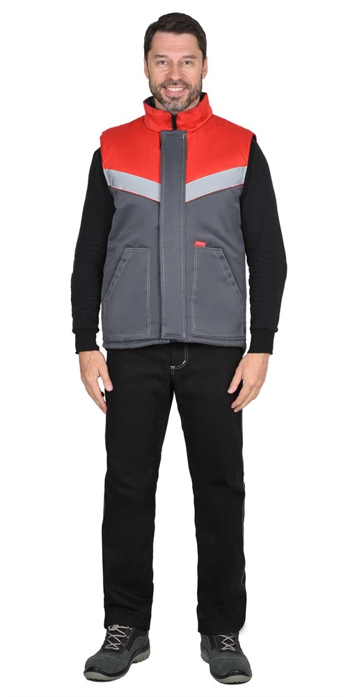 Жилет утепленный, с центральной бортовой застёжкой на тесьму - «молнию», с ветрозащитной планкой застегивающийся на потайные липучки 3шт., с накладными карманами с косым входом, с внутренним карманом застегивающийся на тесьму - «молния», с фигурной линией низа. В жилете предусмотрен лента светоотражающая (серая) 50мм 100% п/э для обеспечения сигнальной видимости в условиях пониженной видимости.