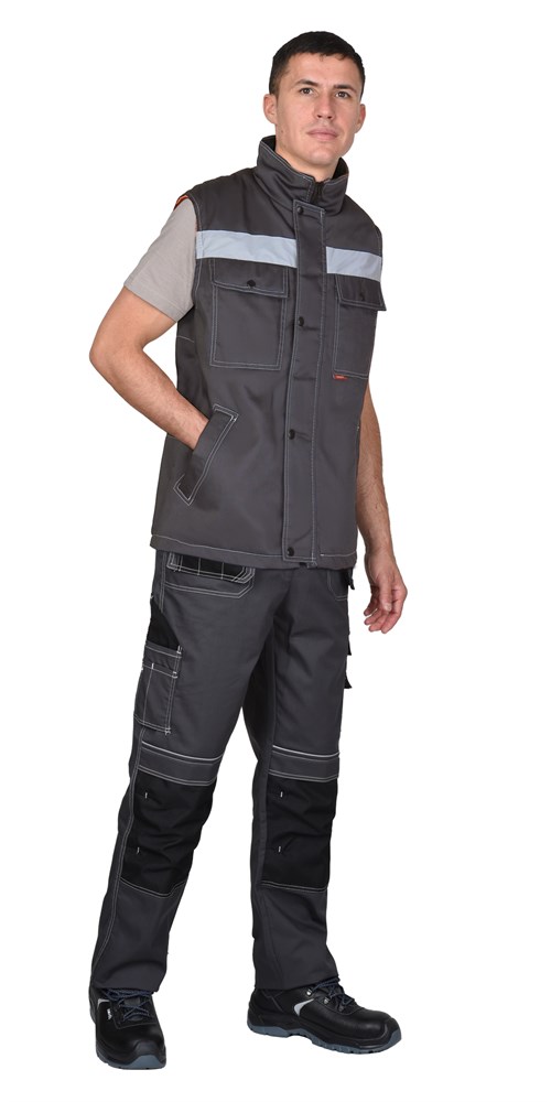 Жилет утеплённый, стёганый, прямого силуэта, на подкладке, с центральной застёжкой на молнию, накрытую ветрозащитным клапаном с кнопками, нижними прорезными карманами, нагрудными накладными карманами с клапаном, внутренним карманом на подкладке с молнией, с воротником стойка. Жилет со светоотражающими полосами для обеспечения сигнальной видимости.