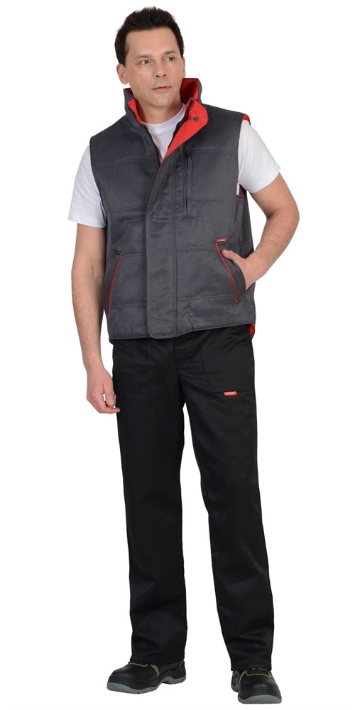 Жилет прямого силуэта утепленный с застежкой на молнию, с планкой. Воротник – стойка. Полочки с двумя нижними прорезными карманами. Внутренний накладной карман. Спинка удлинена.