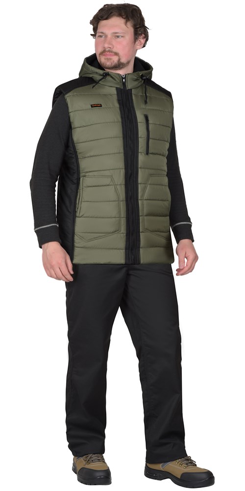 Жилет комбинированный из ткани двух цветов, с центральной застежкой на молнию, с удлиненной фигурной линией низа по спинке, с втачным капюшоном. Центральные части переда и спинки простеганы вместе с утеплителем. Жилет с левым нагрудным прорезным карманом на молнию, нижние карманы в швах. На подкладке с правой стороны накладной карман на молнию.