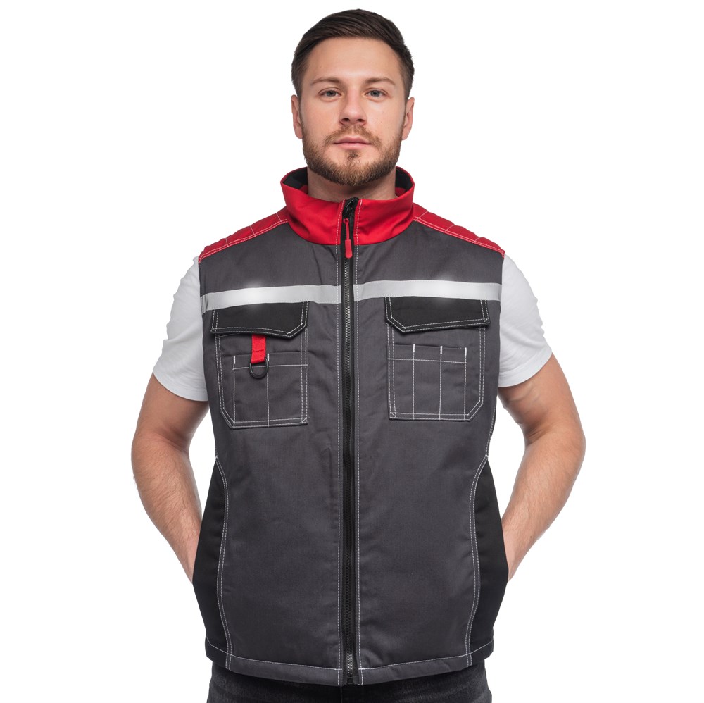 Жилет «ФОРМУЛА» выполнен в классическом фасоне из высококачественных материалов. Утепленный жилет с контрастной отстрочкой подходит как мужчинам, так и женщинам. Он оснащен центральной застежкой - молнией с внутренней планкой, огибающей верхний край молнии. На модели расположены внутренний накладной карман, верхние накладные карманы и фигурные клапаны на липучке. На жилете D-образное кольцо для крепления бейджа и других предметов первой необходимости. Нижние прорезные карманы закрываются на тесьму «молния». Воротник-стойка на флисовой подкладке, удлиненная спинка и контрастная подкладка красного цвета. Для безопасной работы сотрудника в местах с плохим освещением на кокетке полочки и спинки предусмотрена светоотражающая лента шириной 25 мм для эксплуатации в условиях плохой видимости.